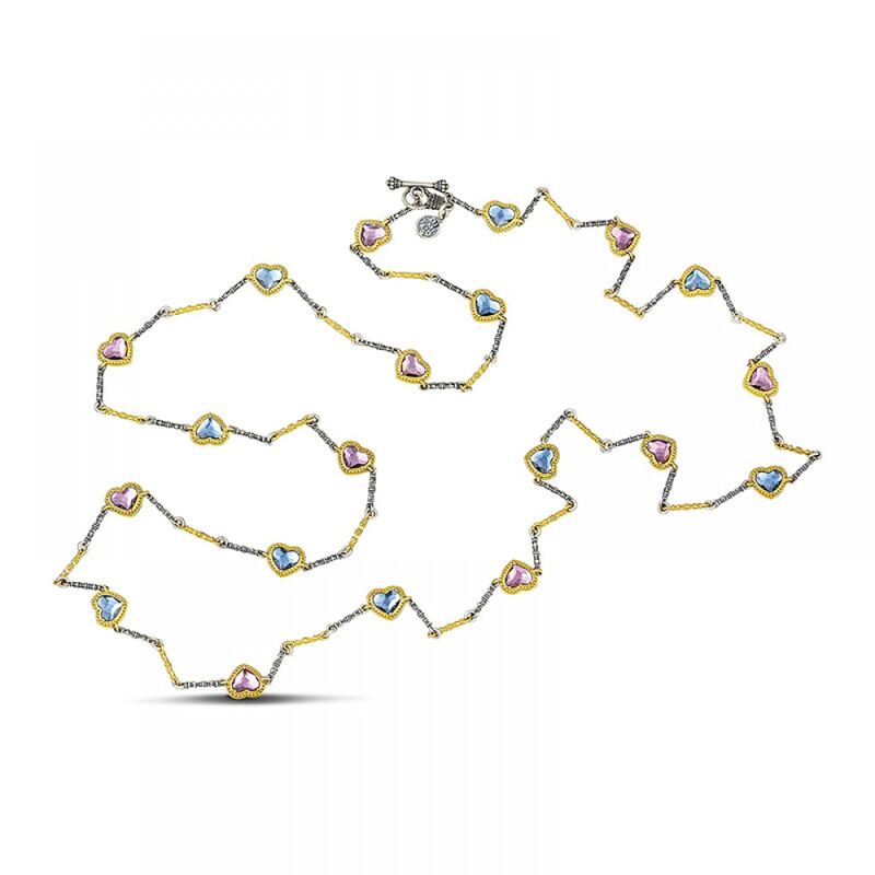 Collar diseño bizantino en plata 925 y bañado oro con cristales en forma de corazón en colores roza y azul.