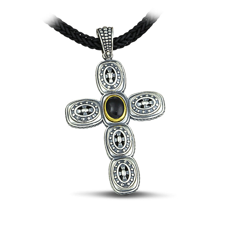 Collar cruz estilo bizantino en plata 925 y bañado oro con onyx