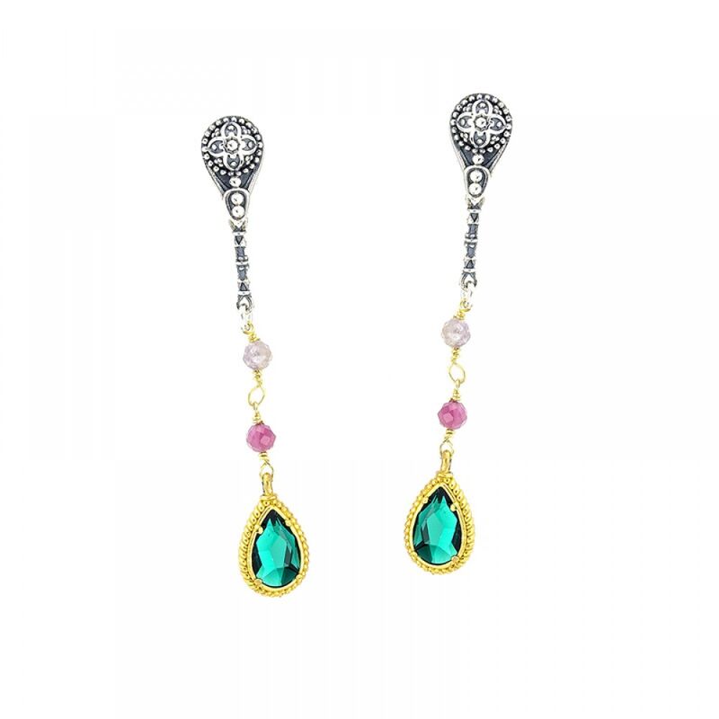 Pendientes en plata 925 bañado en oro con detalle de lágrima reversible en color verde y azul celeste